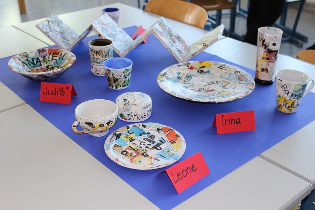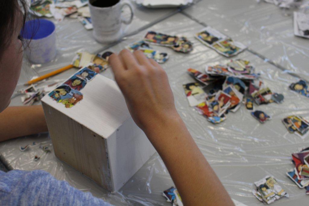 In diesem Workshop werden Gegenstände (Bilderrahmen, Teller, Tablett, Dosen etc.) mit Papier und Comics collagiert/beklebt. Die SchülerInnen erhalten zum Thema Comic eine Einführung bzw. einen kurzen Rückblick zur Geschichte der Comics. Dann werden die einzelnen Elemente eines Comics erklärt: Panell, Rinnstein, Splashpage. Weitere Gesprächsimpulse: Was kennt ihr für Comics? Gibt es noch andere Arten von Comics? (Mangas, Graphic Novels). Was gefällt euch an dem Medium? usw.