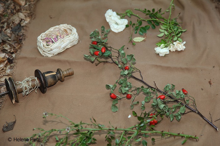 • Tuch, Dornen, Rosenblüten, Spindel für "Dornröschen"