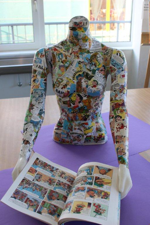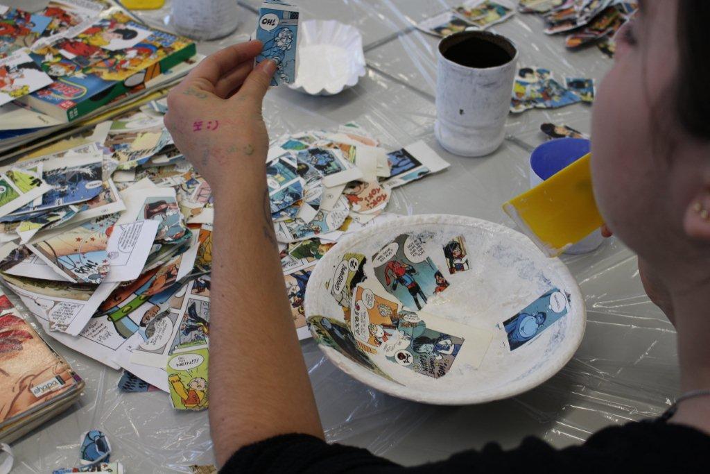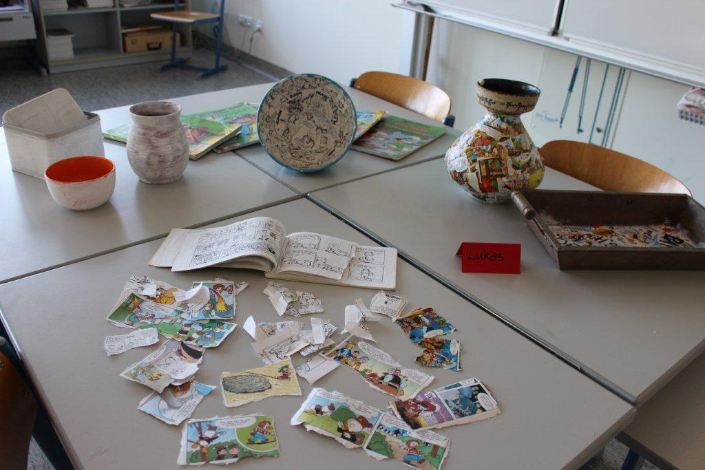 In diesem Workshop werden Gegenstände (Bilderrahmen, Teller, Tablett, Dosen etc.) mit Papier und Comics collagiert/beklebt. Die SchülerInnen erhalten zum Thema Comic eine Einführung bzw. einen kurzen Rückblick zur Geschichte der Comics. Dann werden die einzelnen Elemente eines Comics erklärt: Panell, Rinnstein, Splashpage. Weitere Gesprächsimpulse: Was kennt ihr für Comics? Gibt es noch andere Arten von Comics? (Mangas, Graphic Novels). Was gefällt euch an dem Medium? usw.