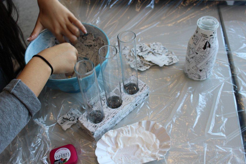 Die SchülerInnen haben Comics ausgewählt, die sie mit nach Hause genommen haben, um sich damit auseinanderzusetzen. Bei einem Tagesworkshop kann das natürlich vor Ort geschehen. Anschließend haben die SchülerInnen die Seiten, Sprechblasen, Figuren oder Worte aus den Comics ausgerissen, die sie auf die Gegenstände aufbringen möchten. Es ist wichtig, dass die Sachen nicht ausgeschnitten werden, denn ausgefranste Ränder sehen cooler aus. Die Gegenstände müssen mit Gesso (Kreidegrund) zweimal grundiert werden, um die Saugfähigkeit des Klebers zu verbessern und ein schöneres Klebeergebnis zu erzielen. D. h. einmal grundieren und trocknen lassen (ca. 30 Min.), dann ein zweites Mal grundieren. Es kann sonst passieren, dass sich das Papier wieder löst oder der Gegenstand eine klebrige Oberfläche behält. Die gerissenen Papiere werden dann mit Acrylbinder auf die grundierten Flächen aufgebracht. Zuerst stellenweise den Binder satt auftragen, dann das Papier auflegen und mit der Spachtel glattstreichen. Überschüssigen Binder einfach auf die nächste Stelle, die beklebt werden möchte, aufbringen. Schöner wird es, wenn mehrere Schichten Papier nacheinander aufgeklebt werden. Gut trocknen lassen. Wenn die Gegenstände trocken sind, kann weitergearbeitet werden. Wenn das eine oder andere Stück nicht ganz trocken ist, empfehle ich zu föhnen. Anschließend kann nochmals Papier aufgeklebt werden oder mit Edding-Stiften Worte, Schriften, Zeichnungen aufgemalt werden. Nochmals trocknen lassen. Fertig!