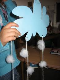 g) Basteln zum Thema: Schneewolken zum Mitnehmen (weißer Karton in Wolkenform mit Watteflocken an Nähseide) (Aus: Ursula Barff, Inge Burkhardt u. Jutta Maier, Das große farbige Bastelbuch für Kinder, S. 36)