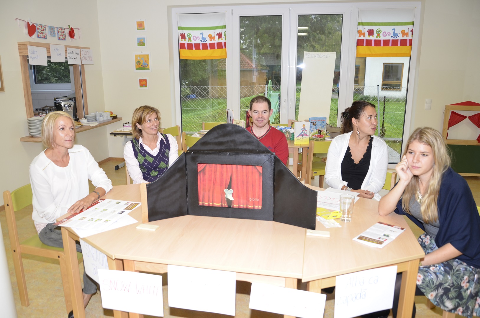 - A4 Zettel mit bekannten Wörtern oder Sätzen, z.B Danke, Bitte, Auf Wiedersehen, Wie geht es dir?, usw. in den verschiedenen Sprachen - in verschiedenen Farben - schreiben und in den Räumlichkeiten aufhängen